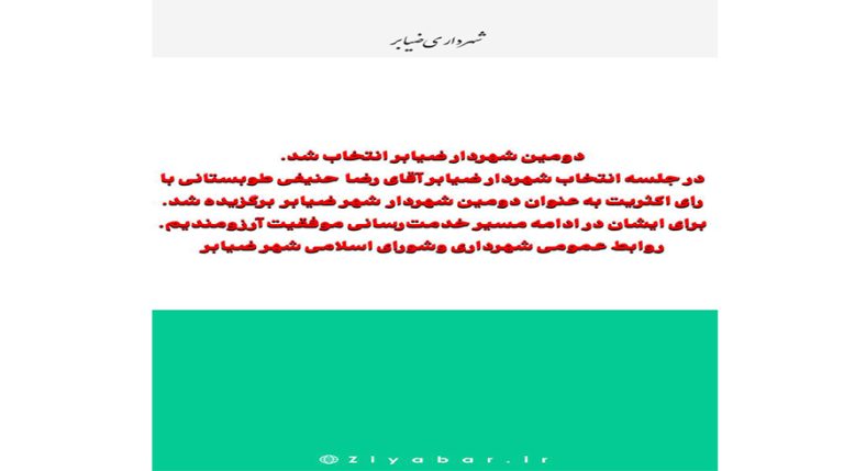دومین شهردار ضیابر انتخاب شد.در جلسه انتخاب شهردار ضیابراقای رضا حنیفی طوبستانی با رای اکثریت به عنوان دومین شهردار شهر ضیابر برگزیده شد.برای ایشان در ادامه مسیر خدمترسانی موفقیت آرزومندیم. روابط عمومی شهرداری و شورای اسلامی شهر ضیابر